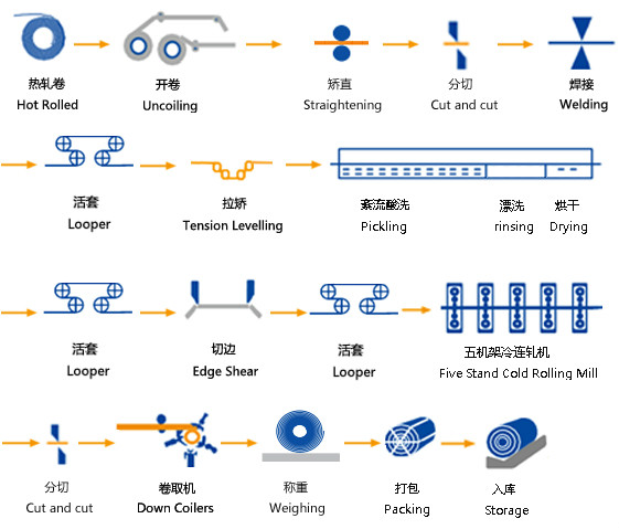酸轧机组由日本三菱日立公司总设计,引进日本三菱日立的关键技术和设备。采用MH最新开发的i-BOX酸洗技术,轧机段采用高性能UCM轧机,板形调控手段丰富,厚度、板形控制能力强,适合薄规格、高强钢产品生产,具有产品精度高、成材率高的特点。该机组设计年产商品卷202万吨,设计规格0.25-2.5*830-1880mm,产品包括低碳、超低碳钢及高强钢,最高强度级别780MPa。